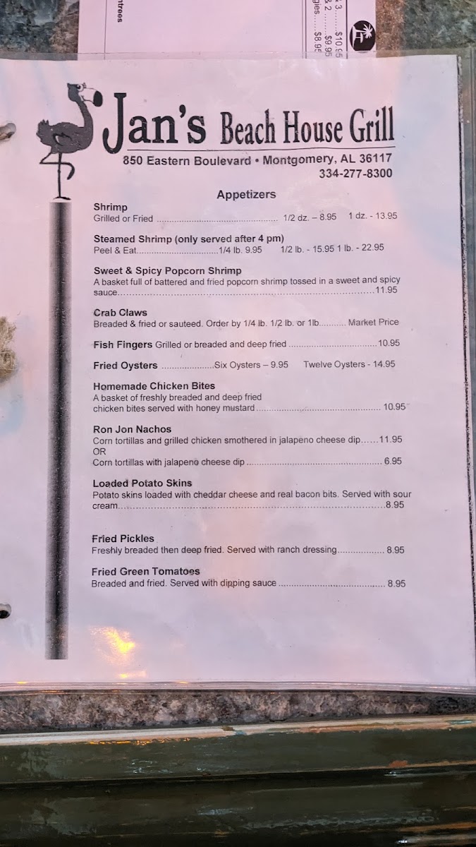 Jan's Beach House Grill, where the flavors of the coast come alive! Nestled at 850 Eastern Blvd #850 in Montgomery, AL, our menu is a delightful journey through classic coastal cuisine that you won’t want to miss. Indulge in our signature Fried Pickles, crispy Fried Shrimp, and mouthwatering Fried Oysters, each dish brimming with flavor. For something different, try our Smoked Tuna Dip or Seafood Combination, guaranteed to tantalize your taste buds. Don’t forget to save room for dessert—our Chocolate Mousse Cake and Key Lime Cake are the perfect way to end your meal! Whether you're in the mood for comfort food like our Fried Crab Claws or the savory Pulled Pork with Sweet Potato Fries, Jan's Beach House Grill is the perfect spot for a delicious getaway. Join us today for a culinary experience that captures the essence of beachside dining!